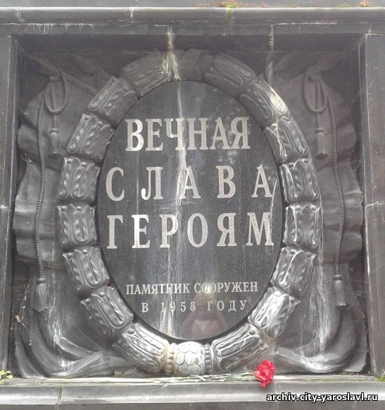 В начале прямоугольной клумбы, расположенной перед памятником, установлена мраморная плита с текстом: «В июле 1918 года при подавлении контрреволюционного белогвардейского мятежа в Ярославле смертью храбрых пали верные сыны трудового народа и коммунистической партии. В числе погибших товарищи: Нахимсон, Закгейм, Зелинченко, Лютов, Шмидт, Кожин, Симановский, Куконков и другие. Вечная слава героям, павшим в борьбе за счастье народа».
