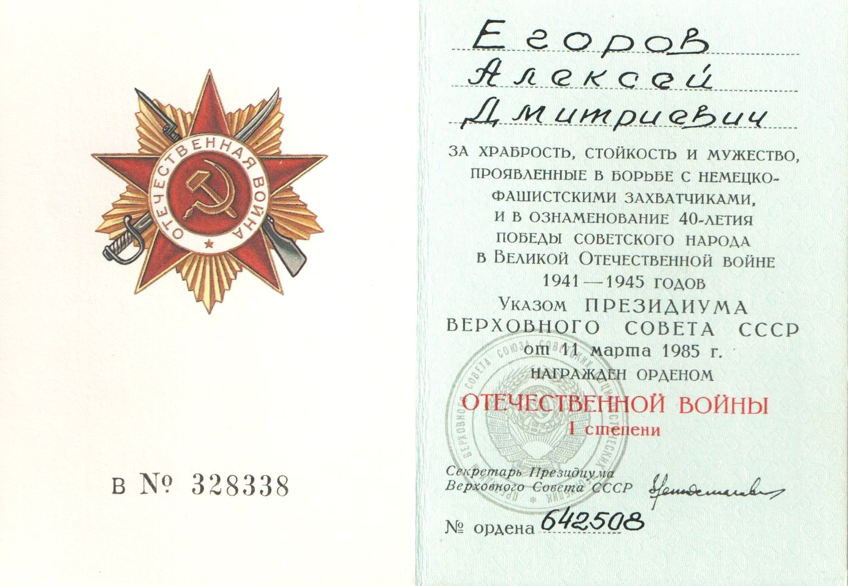 Учреждение Ордена Отечественной войны стало важным событием в истории Советского Союза периода Великой Отечественной войны. Награды помогли поднять моральный дух бойцов, усилить патриотические чувства и мотивацию среди личного состава армии и флота. За годы войны орденами были отмечены сотни тысяч героев, чьи подвиги вошли в историю страны. Орден Отечественной войны занимал особое место среди других наград. Статут требовал от представляемого к награде абсолютно конкретных, вполне определенных действий, боевых подвигов. Статут Ордена Отечественной войны I степени предусматривал 30 различных боевых ситуаций, а II степени - 25. Многие ветераны получили награду спустя десятилетия после завершения военных действий. В фондах муниципального архива сохранились документы участников Великой Отечественной войны 1941 - 1945 годов, награжденных Орденами Отечественной войны I и II степени. Егоров Алексей Дмитриевич награжден Орденом Отечественной войны I степени. Егоров Алексей Дмитриевич (1913 - 2008) родился в деревне Высоково Переславского района Ярославской области. Ф.279.Оп.1.Д.1. В августе 1941 года Алексей Дмитриевич был призван в Красную Армию. Служил на Западном фронте в 518 стрелковом полку. 20 ноября 1941 года в бою под Москвой тяжело ранен осколком мины. В 1942 году Алексей Дмитриевич демобилизован из армии в звании красноармейца. Железняков Иван Васильевич награжден Орденом Отечественной войны II степени. Иван Васильевич (1917-1993) родился в деревне Чагино Брейтовского района Ярославской области. Ф.279.Оп.1.Д.1. В 1939 году Иван Васильевич призван в Красную Армию для прохождения срочной службы. С августа 1941 года служил на Западном фронте в 213 отдельной танковой бригаде 331 стрелковой дивизии командиром стрелкового орудия. Во время службы в армии присвоено звание старшего сержанта. В боях на подступах к Восточной Пруссии уничтожил три противотанковых орудия, две пулеметные точки, шесть автомашин и дот батальона пехоты противника. Шувалов Георгий Петрович награжден Орденом Отечественной войны II степени. Георгий Петрович (1909-1990) родился в деревне Харенцы Тутаевского района Ярославской области. Ф.279.Оп.1.Д.1. В январе 1942 года Георгий Петрович призван в Красную Армию. Служил в 54 Сталинской стрелковой бригаде наводчиком пулемета. Находясь под городом Велижем Смоленской области, бригада получила задание занять два сильно укрепленных района немцев у деревни Вышегоры. Красноармеец Шувалов Георгий Петрович поддержал свою роту пулеметным огнем и обеспечил взятие деревни с малыми потерями. В декабре 1942 — январе 1943 года во время наступления бригады на Великие Луки Шувалов Г.П. огнем своего пулемета уничтожил до 500 гитлеровцев.